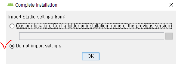 11. Android Studio를 처음 시작하면 이러한 화면이 나타난다. Do not import settings를 클릭하면 기존에 했던