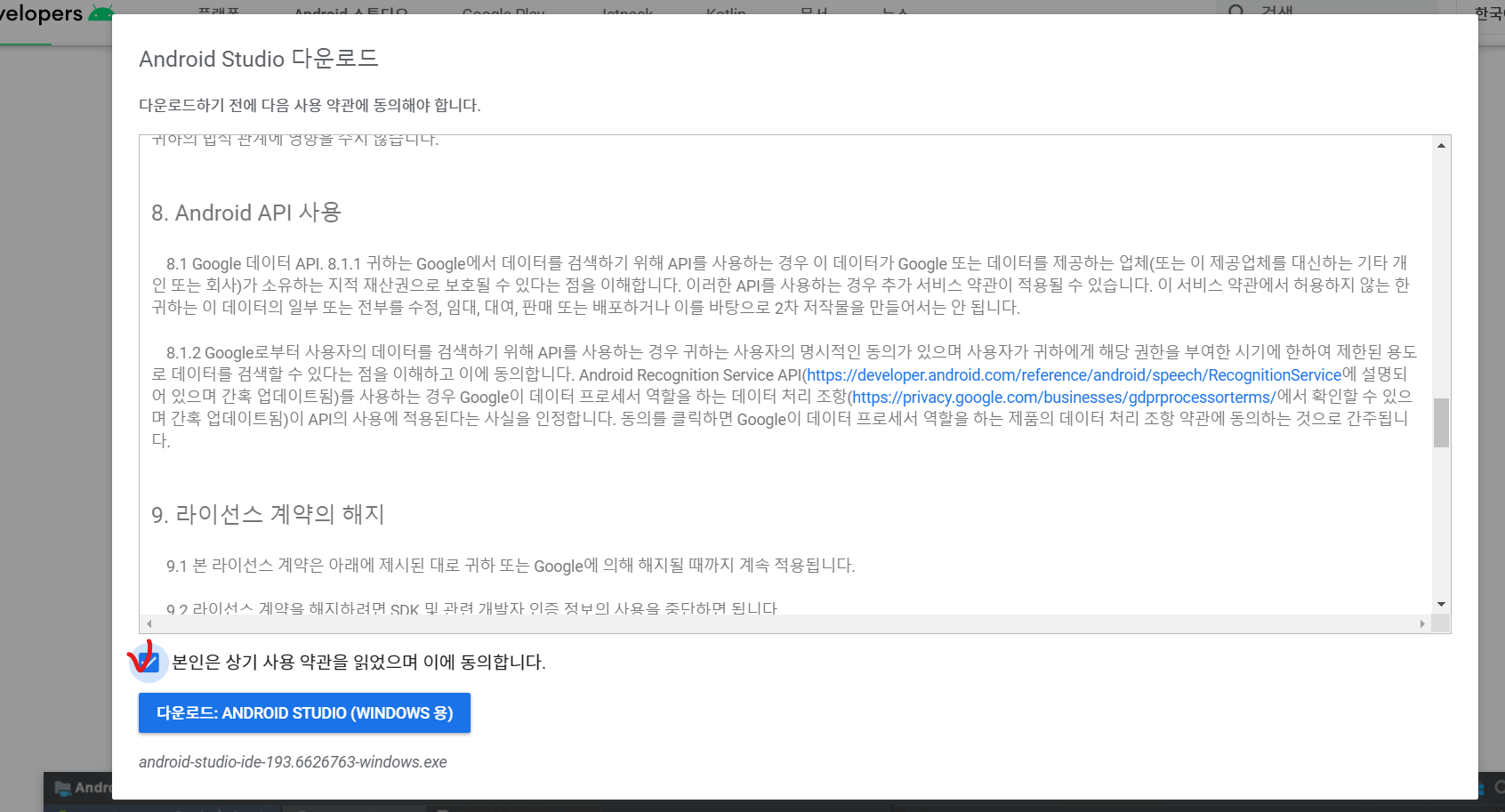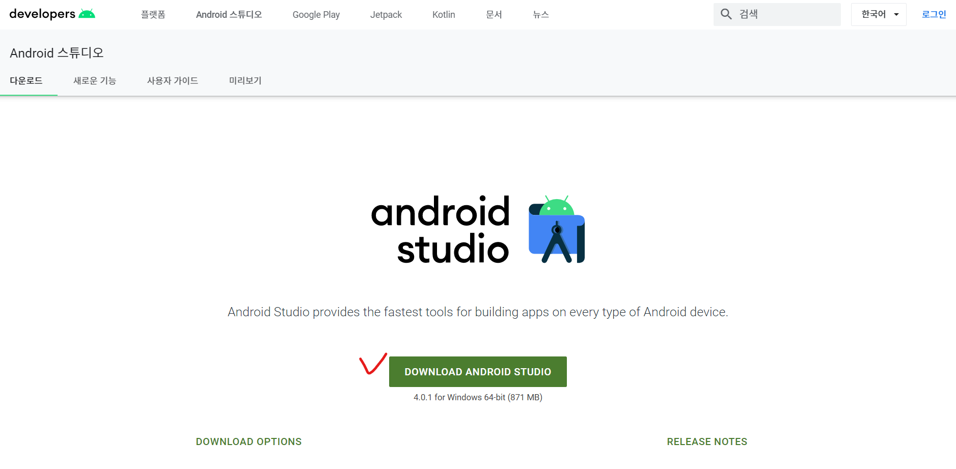 안드로이드 스튜디오를 설치하기 위해서 https://developer.android.com/studio/ 에 접속한다.
