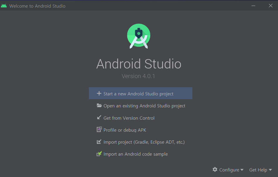15. 이후 설치까지 완료하게 되면 최종적으로 이 화면이 나온다. Start a new Android Studio project를 누르게 되면